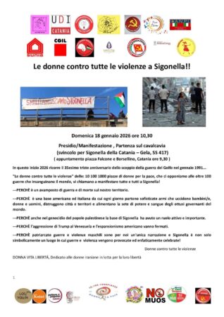Domenica 18 gennaio 2026 ore 10.30 Presidio/Manifestazione, Piazzale della Catania/Gela (appuntamento piazza Falcone e Borsellino, Catania ore 9.30) In questo inizio 2026 ricorre il 35esimo triste anniversario dello scoppio della guerra del Golfo nel gennaio 1991…“Le donne contro tutte le violenze” delle: 10 100 1000 piazze di donne per la pace, che ci opponiamo alle … Leggi tutto