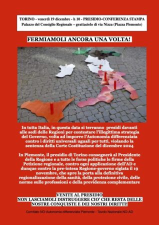Pubblichiamo di seguito il comunicato dell’ Esecutivo nazionale dei Comitati per il ritiro di qualunque Autonomia differenziata, l’unità della Repubblica e l’uguaglianza dei diritti del 19 novembre 2025 I Comitati per il ritiro di ogni Autonomia differenziata, l’unità della Repubblica e l’uguaglianza dei diritti, rivolgono a tutte le forze democratiche politiche, associative, sindacali, istituzionali un … Leggi tutto