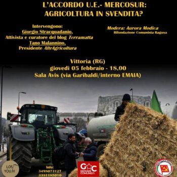 di Peppe Puccia, Segretario Federazione Siracusa/Ragusa Giovedì 5 febbraio alle ore 18.00, nella Sala Avis di Vittoria, si terrà l’iniziativa pubblica “L’accordo U.E.–Mercosur: agricoltura in svendita?”, promossa da Giovani Comunisti/e, Rifondazione Comunista Siracusa–Ragusa e dal Movimento Lost Youth con gli interventi di Giorgio Stracquadanio e Tano Malannino e la moderazione di Aurora Modica, un appuntamento che … Leggi tutto